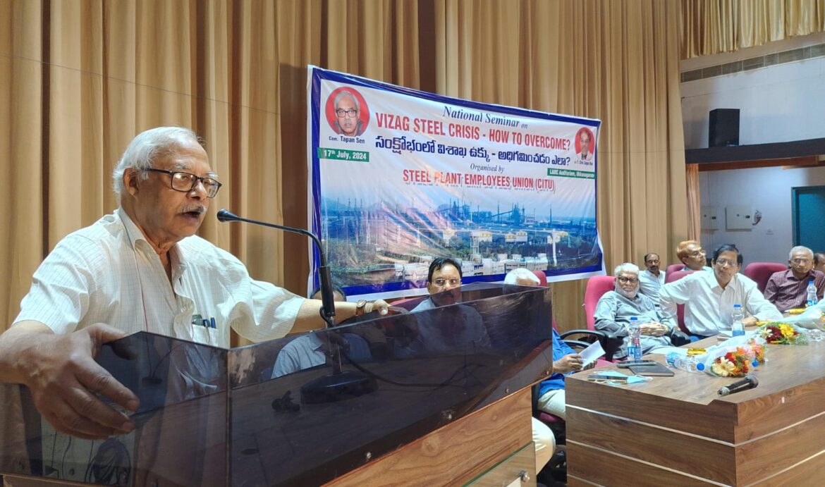 నేడు విశాఖ స్టీల్ ప్లాంట్ ఎదుర్కొంటున్న సంక్షోభాన్ని కేంద్ర ప్రభుత్వం కుట్రలతోనే సృష్టిస్తోందని అఖిల భారత సిఐటియు ప్రధాన కార్యదర్శి కామ్రేడ్ తపన్ సేన్ తీవ్రంగా విమర్శించారు. నేడు స్టీల్ సిఐటియు ఆధ్వర్యంలో ట్రైనింగ్ సెంటర్ ఆడిటోరియం లో “సంక్షోభంలో విశాఖ ఉక్కు-పరిష్కారం ఎలా”అనే అంశంపై సదస్సు నిర్వహించారు.